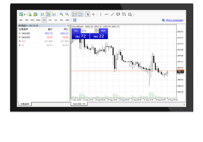 香港现货黄金平台应用性能指标完善健全,具有高度普及化,可中英双语可以来回切换。并且自身功能多种多样,9个交易时段数据图表选项,30个内嵌技术指标和24种图形工具,实时同步现货黄金、现货白银等各类期货实时报价,让用户可以及时见到市场行情趋势变化,同时MT4软件兼有止损止盈功能,用户可以根据下单价格设定理想位置。